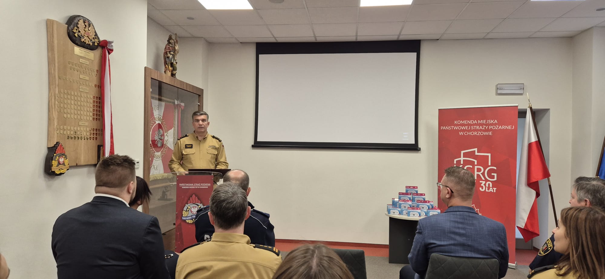 W dniu 28 października 2025 r. w Komendzie Miejskiej Państwowej Straży Pożarnej w Chorzowie w ramach trwającej ogólnopolskiej kampanii „Czujka na straży twojego bezpieczeństwa” odbyło się spotkanie przeznaczone dla zarządców budynków mieszkalnych. W trakcie spotkania organizator omówił zagrożenia występujące w budynkach mieszkalnych związane z ochroną przeciwpożarową, w których wzrasta ryzyko wystąpienia pożaru wraz z rozpoczęciem sezonu grzewczego. Na spotkaniu przedstawiciel Straży Miejskiej w Chorzowie zaprezentował i przedstawił szczegółowe informacje na temat przeprowadzanych kontroli na terenie miasta w związku z obowiązującą ustawą nr V/36/1/2017 Sejmiku Województwa Śląskiego z dnia 7 kwietnia 2017 r. w sprawie wprowadzenia na obszarze województwa śląskiego ograniczeń w zakresie eksploatacji instalacji, w których następuje spalanie paliw.